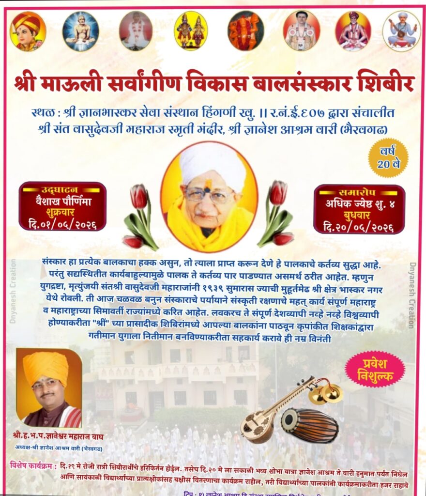 येथील श्रीसंत वासुदेवजी महाराज स्मृती मंदिर, श्री ज्ञानेश आश्रम येथे दरवर्षीप्रमाणे यंदाही १ मे ते २० मे २०२६ या कालावधीत *‘श्री माऊली सर्वांगीण विकास बालसंस्कार शिबिराचे’ भव्य आयोजन करण्यात आले आहे. विशेष म्हणजे यंदा या शिबिराचा सुयोग १७ मे पासून सुरू होणाऱ्या *पुरुषोत्तम (अधिक) मासाशी* जुळून आल्याने या उपक्रमाला अध्यात्मिकदृष्ट्या विशेष महत्त्व प्राप्त झाले आहे.