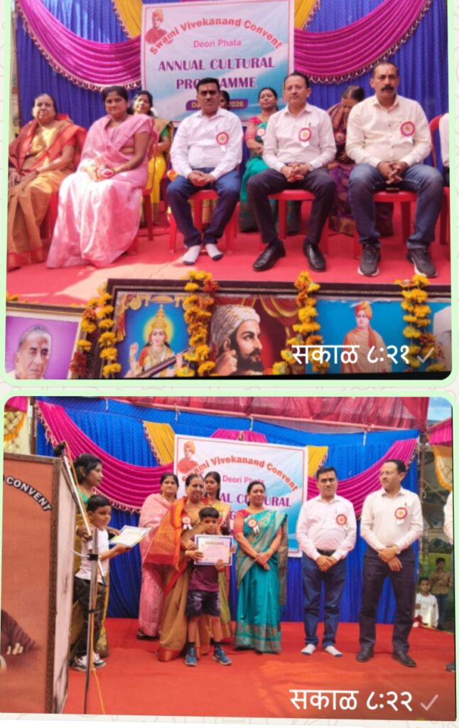 अकोट प्रतिनिधी:- प्रभाकर बोरकर :सालाबाद प्रमाणे 11 जानेवारी रोजी प्रत्येक वर्षाला कॉन्व्हेंट मध्ये वार्षिक संमेलन खूप मोठ्या उत्साहामध्ये संपन्नझाले. सांस्कृतिक कार्यक्रमाची सुरुवात श्री सरस्वती वंदनहे गीत गीत गाऊन विद्यार्थ्यांनी सरस्वतीच्या पूजनाचा व याच गाण्यावर बहारदार नृत्य सुद्धा सादर करण्यात आले. तेव्हा शालेय परिसर अक्षरशः दणाणून गेला.कॉन्व्हेंट मधे घेण्यात आलेल्या विविध स्पर्धा यामध्ये प्राविण्यता पटकावणाऱ्या विद्यार्थ्यांचा मान सन्मान करण्यात आला त्याचप्रमाणे त्यांना मेडल व ट्रॉफी देऊन त्याचा गौरव करण्यात आला. तसेच शालेय सत्रामध्ये विद्यार्थ्यांकडून अनेक सांस्कृतिक व शैक्षणिक क्षेत्रातील चालू वर्षाकरिता ज्यांनी अभ्यासामध्ये चांगली प्रगती केली त्या विद्यार्थ्यांना गौरविण्यात आले या कार्यक्रमाला प्रमुख पाहुणे म्हणून देवरी गावचे न्यायालयीन व्यवस्थेमधील मुंबई उच्च न्यायालयाचे न्यायाधीशश्री.सुभाष पाटील फोक मारे त्यांनी विद्यार्थ्यांचे बालपण हे कशा पद्धतीचे राहते व त्याला कशा पद्धतीने संस्कांर स्वरूप बनविण्यात येते हे कॉन्व्हेंट अंगणवाडी हे घडू शकते तेव्हापासून विद्यार्थ्यांना विद्यार्थी जीवनाची परिभाषा कळते या महत्त्वपूर्ण विषयांमध्ये देवरीयेथील सुभाष पाटील फोक मारे मुंबई उच्च न्यायालयाचे न्यायाधीश यांनी लहान मुलांना व शिक्षक कर्मचारी वर्गाला महत्त्वपूर्ण मार्गदर्शन केले. त्यानंतर संस्थेचे सचिव प्रमोदराव चोपडे यांनी सुद्धा संस्थेच्या व विद्यार्थ्यांच्या पुढील भविष्या करता स्वामी विवेकानंद हे आवश्यक त्याप्रमाणे विद्यार्थ्यांचा सर्वांगीण विकास करण्याकरता कटिबद्ध आहे .असे सुतोवाचन केले या कार्यक्रमाचं सरस्वती पूजन संस्थापक संचालिका श्रीमती प्रभाती चोपडे संस्थेच्या अध्यक्षासौ. भारतीताई चोपडे सचिव डॉक्टर प्रमोद राव चोपडे नागास्वामी इंग्लिश स्कूल गायकवाड सर देवरी गावच्या सरपंच सौ वर्षात गायकवाड जिल्हा परिषद पाटसुल शाळा केंद्रप्रमुख भुरे सर तसेच देवरी आलेवाडी पाटसुल पिंपरी डिक्करदिनोडा मरोडा पंचक्रोशी मधील पालक वर्ग प्रामुख्याने हजर होता.स्वामी विवेकानंद कॉन्व्हेंटच्याप्राचार्य सौ. शुभांगी ताई बंड व स्वामी विवेकानंद कॉन्व्हेंट चे शिक्षक शिक्षकेतर कर्मचारी यांनी सालाबाद प्रमाणे पार पडणाऱ्या वार्षिक संमेलनाला विद्यार्थ्यांकडून महत्वपूर्ण सांस्कृतिक कार्यक्रमाचा उत्कृष्ट कार्यक्रम घडवून आणला त्यामुळे संस्थेचे सचिव यांनी सर्व शिक्षक शिक्षकेतर कर्मचारी यांचे आभार व्यक्त केले