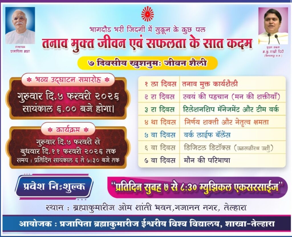तेल्हारा/प्रतिनिधी:-प्रजापीता ब्रह्माकुमारी ईश्वरीय विश्व विद्यालय तेल्हारा च्या वतीने दि. 5 फेब्रुवारी ते 11 फेब्रुवारी या सात दिवसात दरररोज सायंकाळी 6 ते 7:30 वाजेपर्यंत “तणावमुक्त जीवन एवं सफलता के सात कदम” या विषयावर छ्तीसगड राज्यातील बिलासपूर येथील सुप्रसिद्ध प्रवचनकार ब्रह्माकुमारी राखी दीदी यांचे विशेष प्रेरणादायी प्रवचन आयोजित केले आहे.धावपळीच्या युगात काही आनंदाचे क्षण शोधण्यासाठी या दिवसात आनंदी राहण्याची जीवनशैली अनुभवण्याची आणि आनंदी क्षण प्रत्यक्ष जीवनात उतरविण्याची मोठी संधी तेल्हारा वासियांना मिळणार आहे. दररोज च्या नित्य दिनचर्येंतून सायंकाळी दीड तास वेळ काढल्यास प्रत्येकाच्या जिवनात अमूलाग्र बदल घडून येईल. आध्यत्मिक ज्ञान आजच्या वैज्ञानिक युगात किती आणि कसे महत्वाचे आहे याचे शास्त्रीय विवेचन आणि विश्लेषण ब्रह्माकुमारी राखी दीदींच्या सुमधुर वाणीतून एकण्यास मिळणार आहे. 5 ते 11फेब्रुवारी या सात दिवसात जीवनातील अनेक समस्यावर समाधान शोधन्याचा प्रयत्न केला जाईल. 5 फेब्रुवारी पहिल्या दिवशी “तणावमुक्त कार्यशैली” 6 फेब्रुवारीला “स्वयं की पहचान”, 7 फेब्रुवारी तिसऱ्या दिवशी “रिलेशनशील मानजमेंट और टीम वर्क”, 8 फेब्रुवारी “निर्णयशक्ती और नेतृत्व क्षमता” 9 फेब्रुवारी पाचव्या दिवशी “वर्क लाईफ बॅलन्स” 10 फेब्रुवारीला “डिजिटल डिटॉक्स” व 11फेब्रुवारी सातव्या दिवशी “मौन की परिभाषा” हे सात दिवसाचे सात विषय म्हणजे आनंदी, समाधानी आणि खुश राहण्यासाठी सात कदम असणारे आहेत. राखी दीदी यांच्या कर्यक्रमातून अनेकांच्या जीवनात सकारात्मक बदल घडले असून आपणही जर कोणत्याही कारणाने स्वतःला किंवा परिवाराला दुःखी समजत असाल, विनाकारण च्या चिंतेने त्रस्त असाल किंवा स्वतःतील उणीव, कमतरता यामुळे स्वतःला अपयशी समजत असाल तर आपण नक्की या सात दिवसाच्या प्रवचनमालेचा न चुकता लाभ घ्यावा असे आवाहन तेल्हारा ब्रह्माकुमारीज सेवा केंद्राच्या संचालिका राजयोगिनी ब्रह्माकुमारी प्रमिला दीदीजी यांनी केले आहे